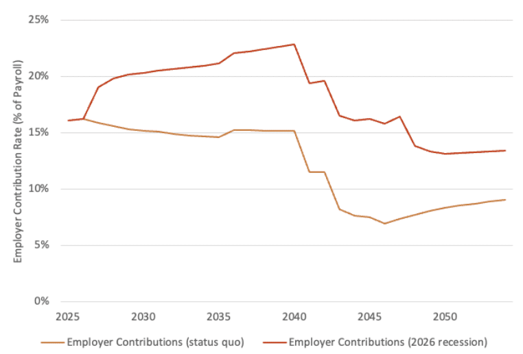 Another major recession would also significantly derail the system. Reason Foundation’s modeling indicates that an investment loss in 2026 similar to that of 2009 (a 20% loss) would result in a funding ratio of 62%, and it would take 15 years just to climb back to today’s funding levels. The full funding date would extend well beyond 2055 in that scenario.